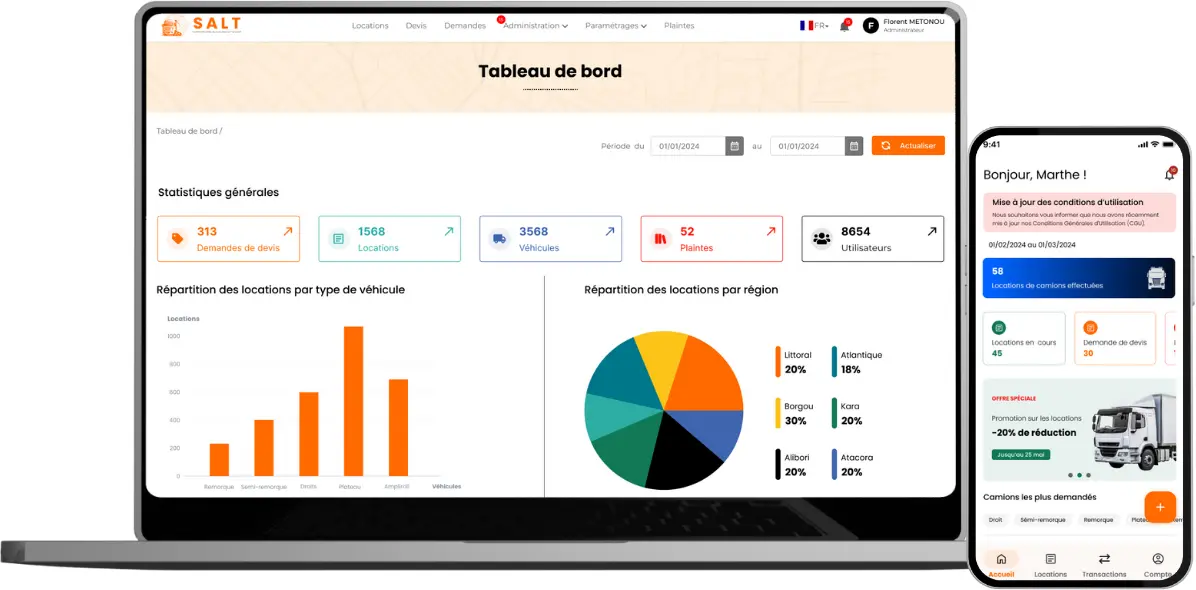 SALT (Société Africaine de Logistique et de Transport) est une entreprise spécialisée dans le Transport et la Distribution de biens et marchandises pour les personnes physiques et morales. Elle offre une plateforme digitale innovante où tous les partenaires, transporteurs, entrepreneurs, entreprises, producteurs agricoles, Marchands, Bénéficiaires peuvent bénéficier d'un service de transport sécurisé, fiable et sur mesure le tout à un tarif préférentiel.